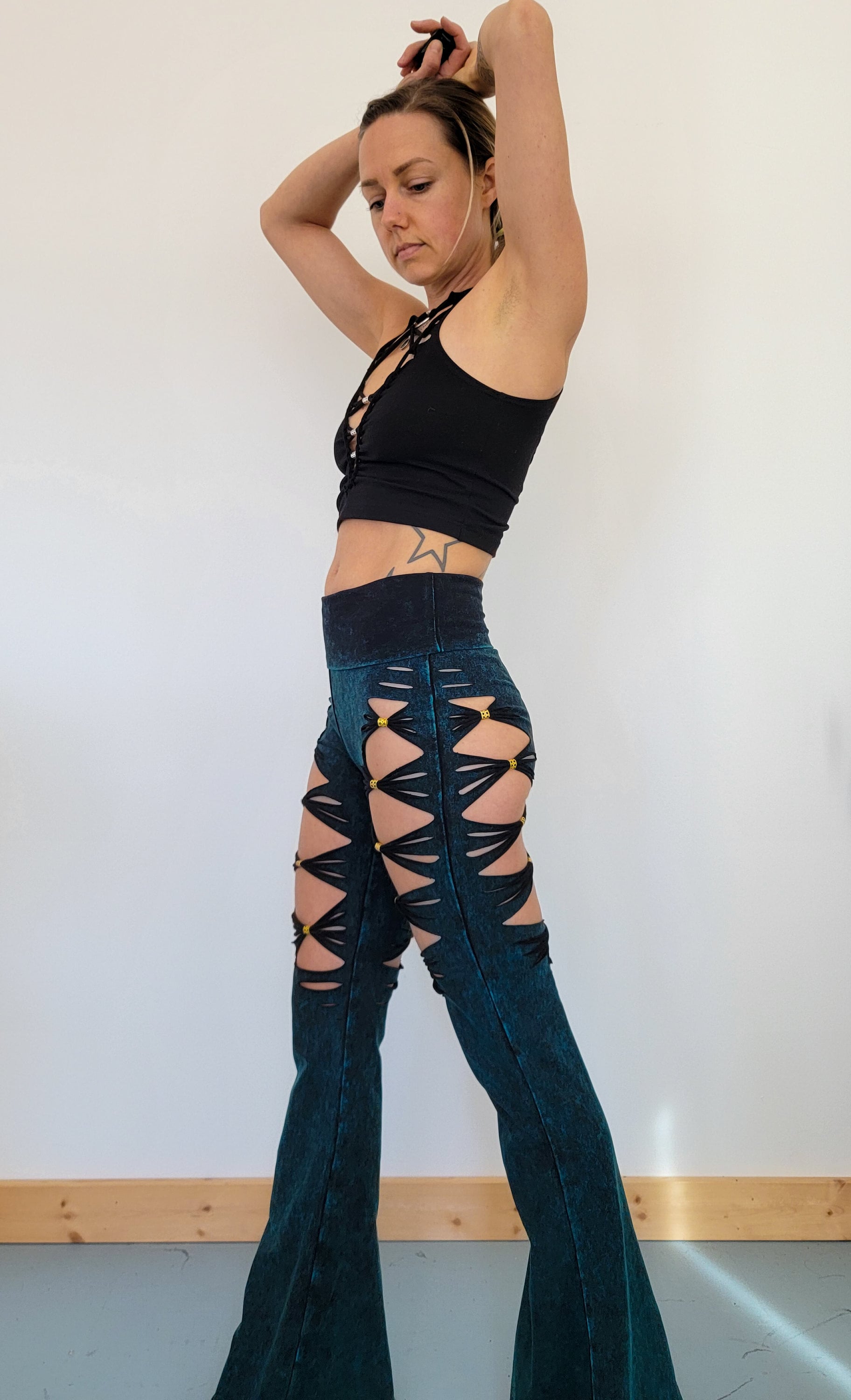 High Waisted Fold over mineral wash braided Flare pants are made with super thick cotton spandex in a beautiful mineral wash style. They have flirty details down the fronts and backs of the thighs that make them easily dress up or dress down, or a fun edition to your festival attire. Nice wide bells are so fun to dance with.