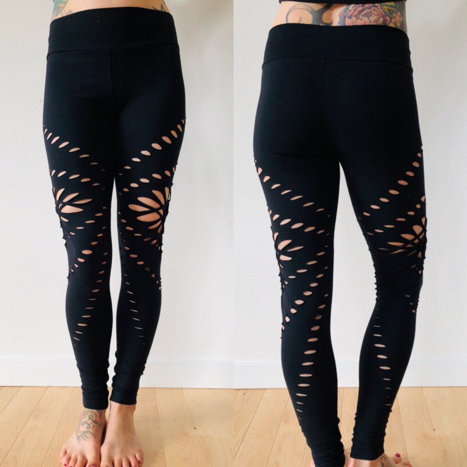ripped up look in a creative design from thigh to ankle, and a braided design middle thigh. These leggings move with you, they are great for dance, look awesome with boots, and will happily go to yoga with you.