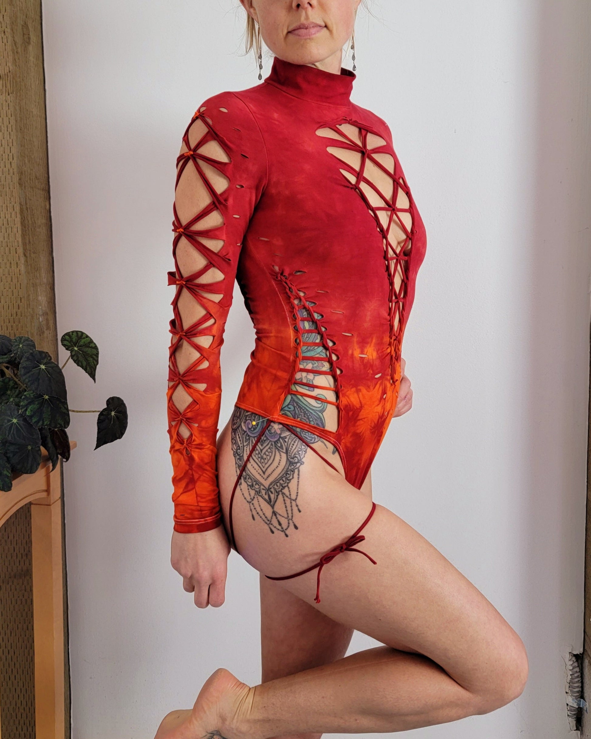 Ignite your performance wardrobe with the Fire Vixen Braided Leo Thong, a fiery blend of passion and artistry, designed for the stage and beyond. With a bold, open braided front and a mock neck that commands attention, this bodysuit is the epitome of daring fashion.
