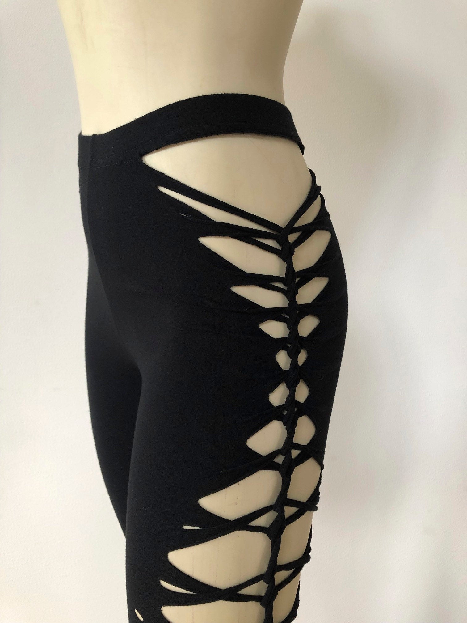 Embrace your inner GODDESS with these Leggings. They are subtly seductive and are made for the ones that like to make a statement. These are a statement at your next festival, on the dance floor, with your hoop, or your next aerial performance. Or a statement at that Pole Class. Braided and cut from upper hip to ankle. These leggings are super sexy.