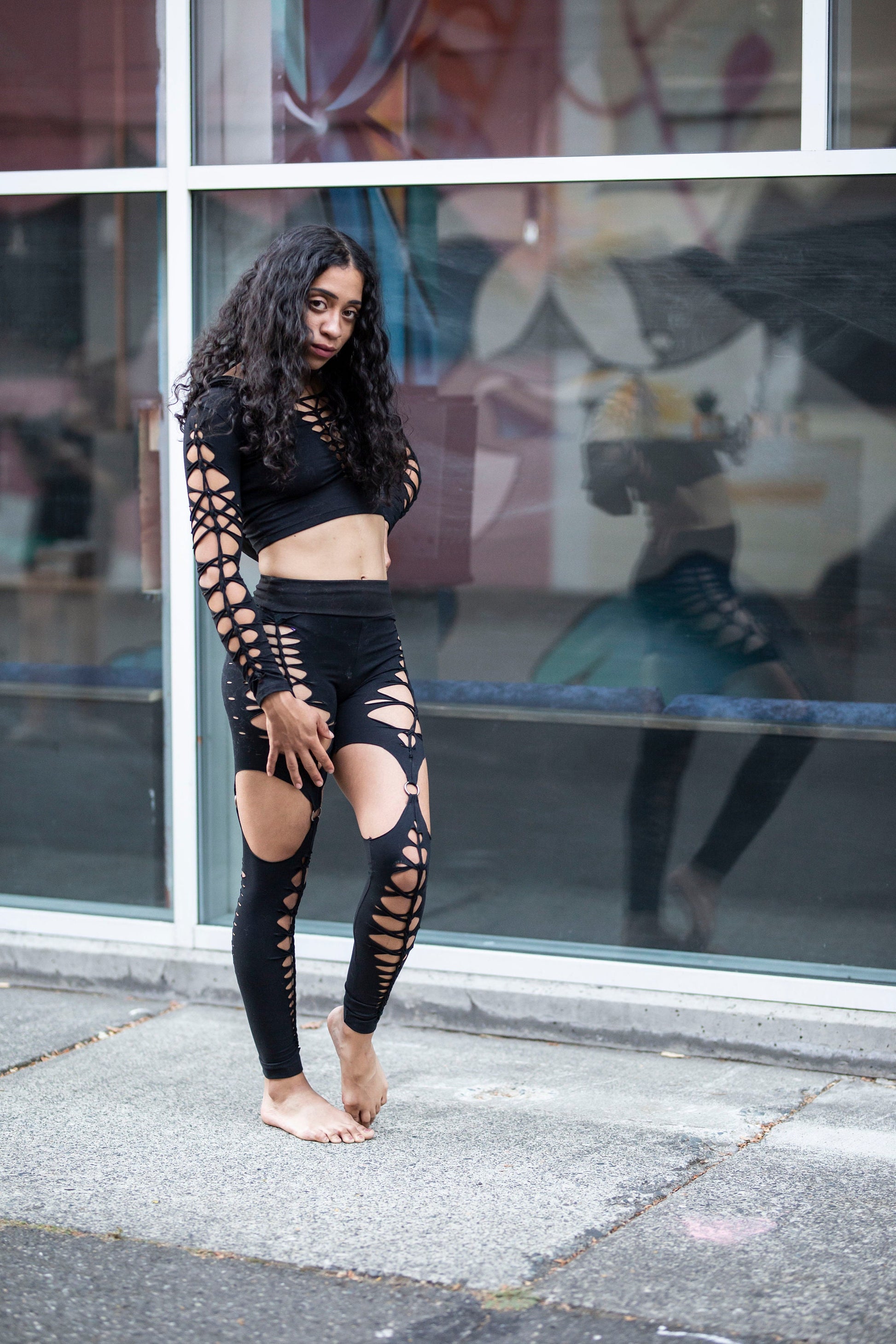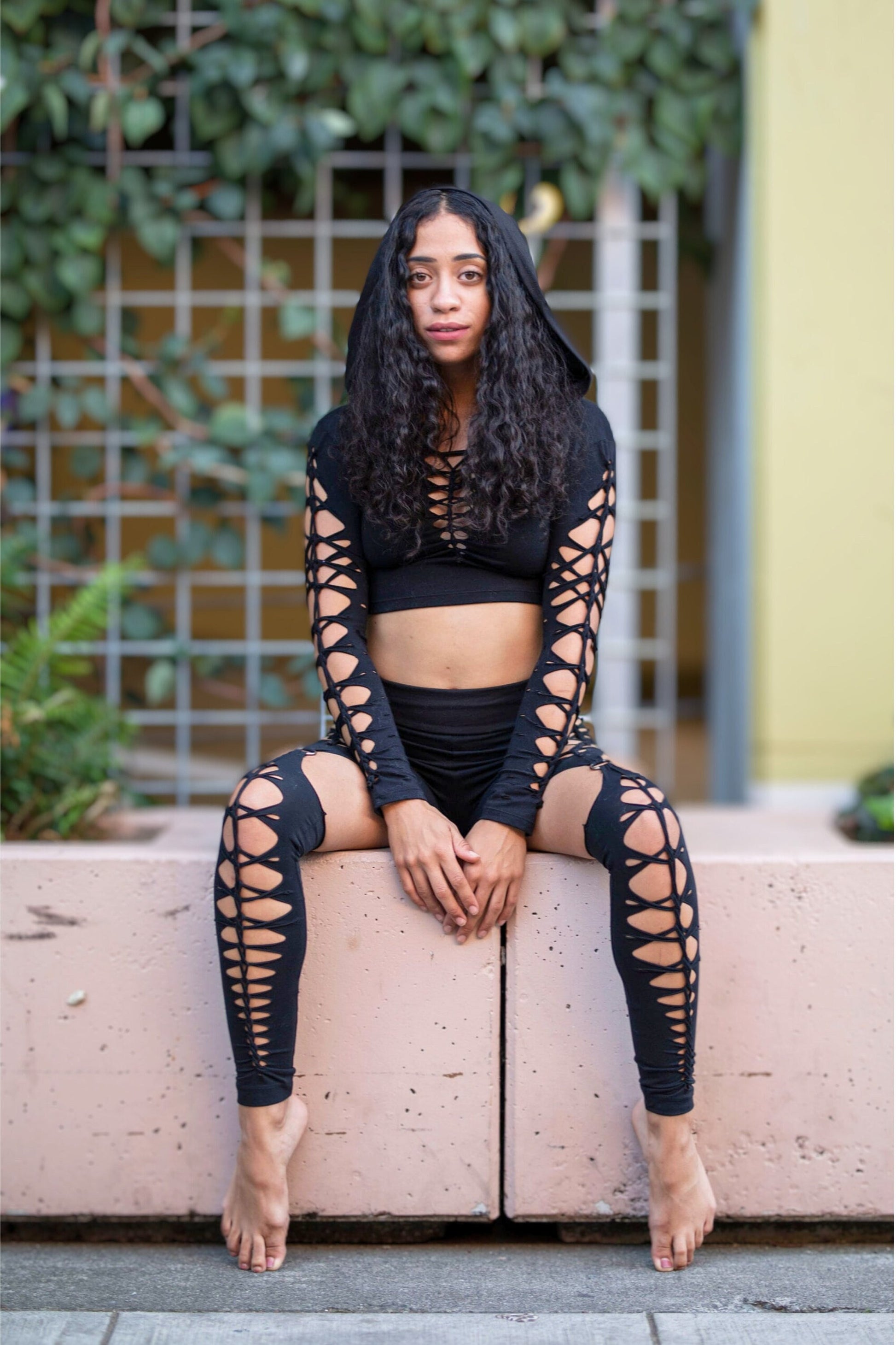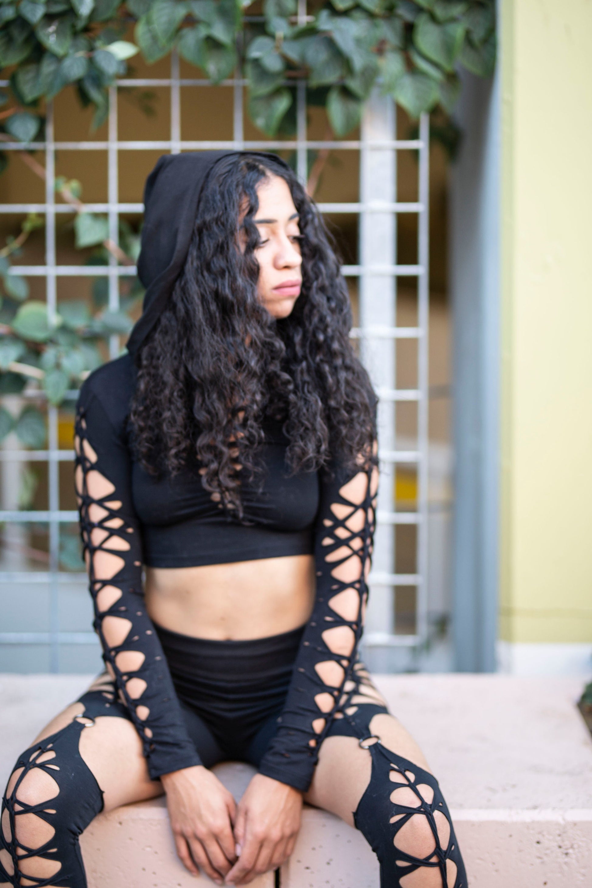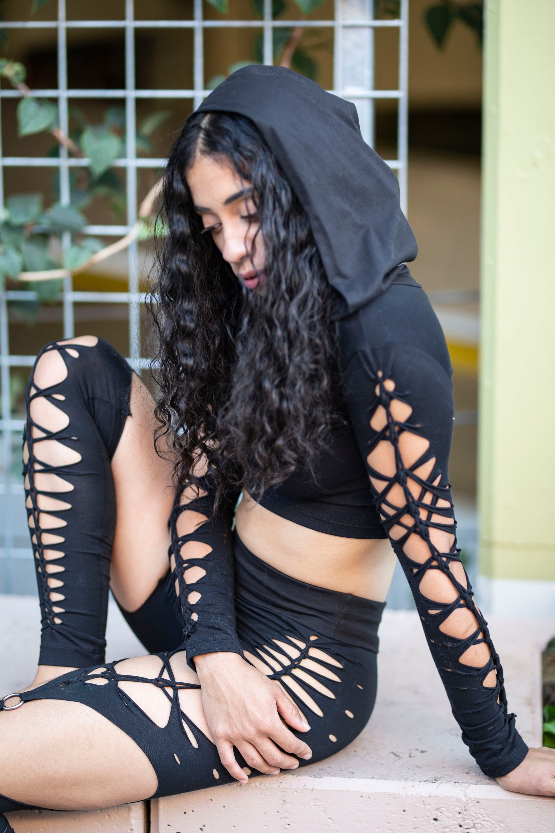 Keya Long Sleeved Hooded crop top is a long sleeved Braided crop with braids down each arm, front and back. The hood is deep and fitted so it is comfortable for fire arts. This top is super comfortable and flattering. There is good coverage with still being sexy. There are braids down the arms and back. This shirt is form fitted, thick jersey and comfortably stretchy. No lining but it is tight enough for me to wear nothing under it, but it all depends on preference. It also looks great with lacy layers.