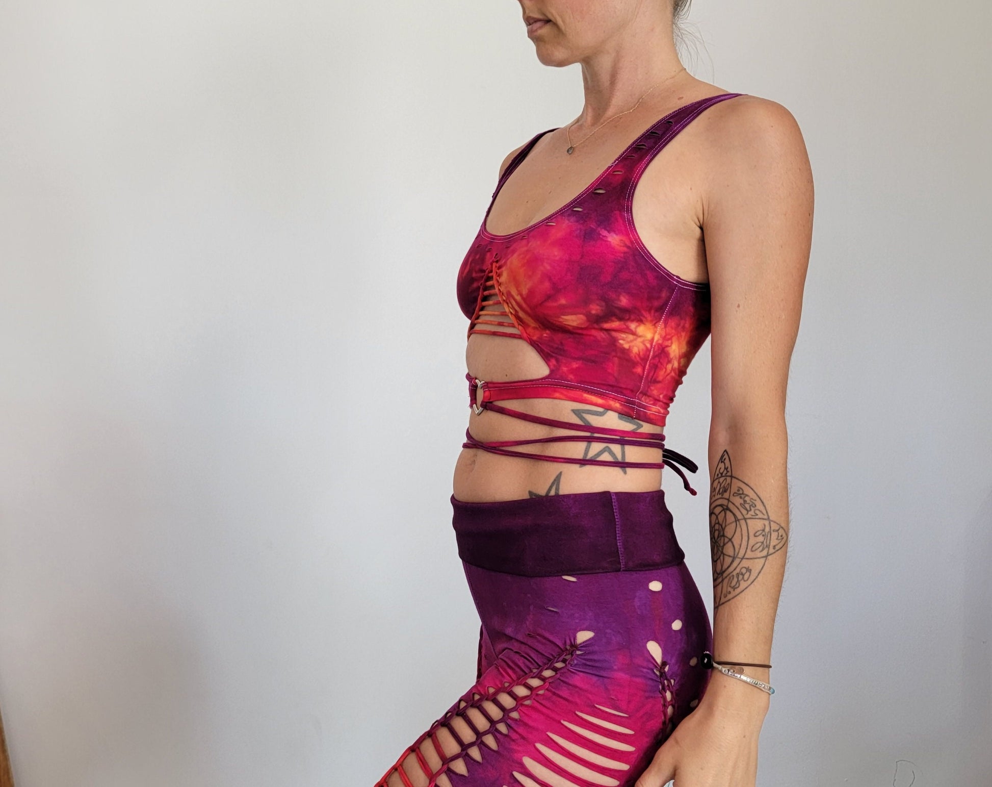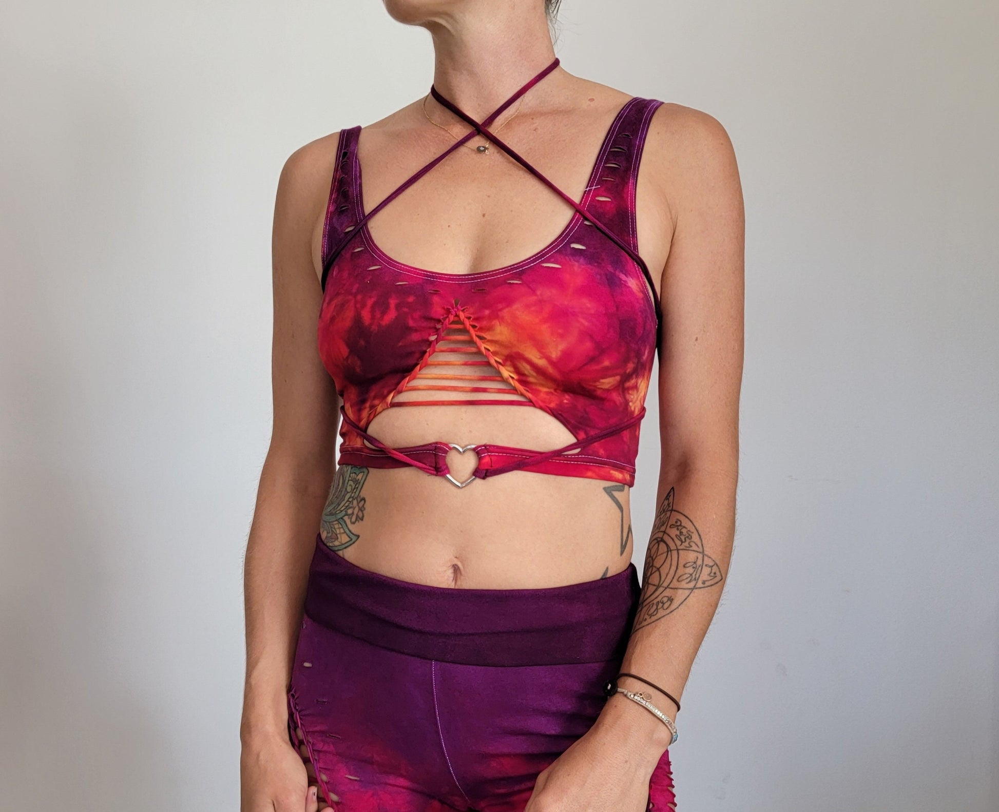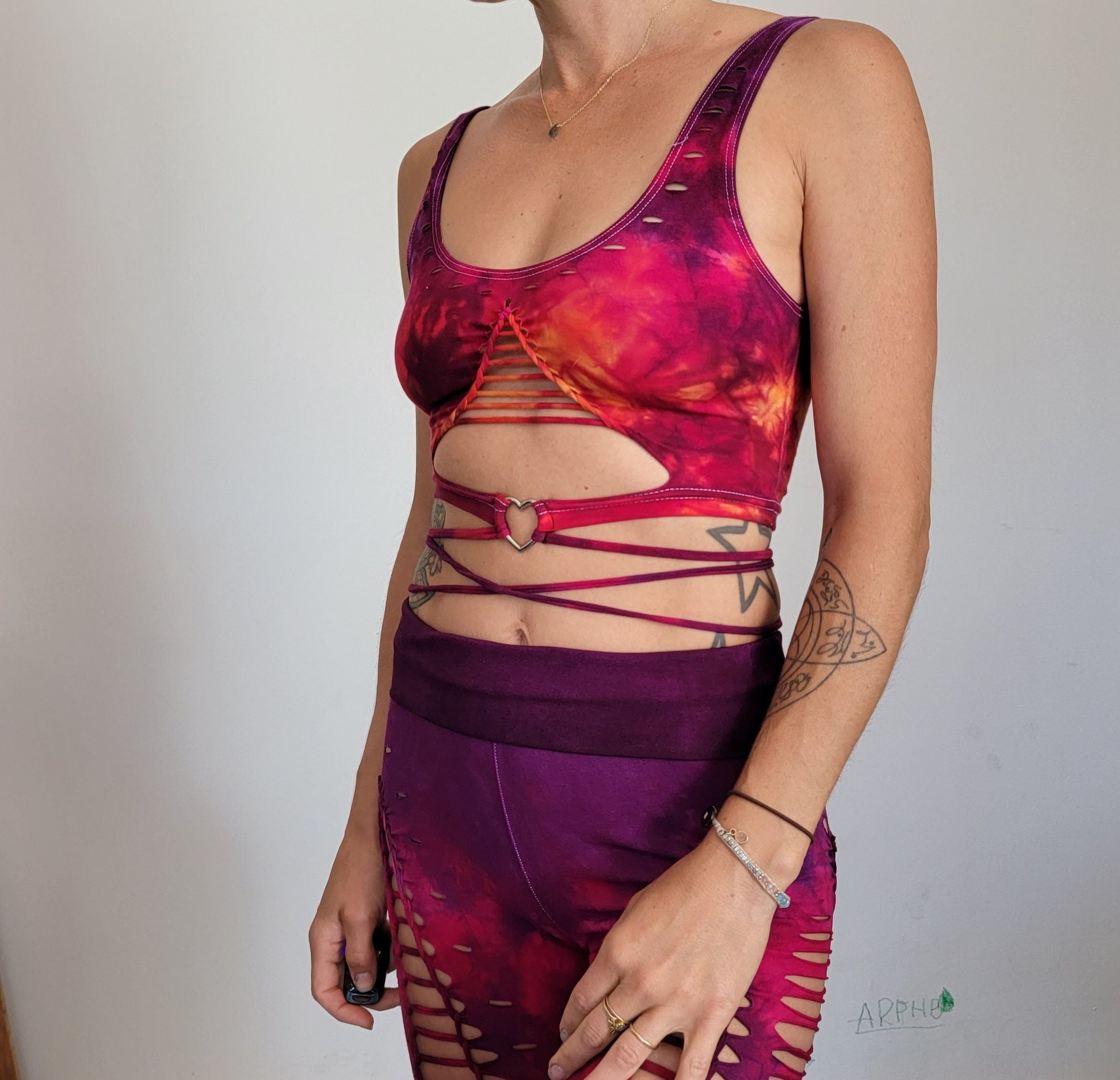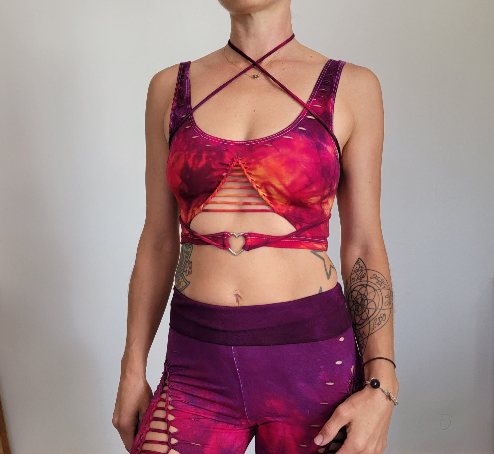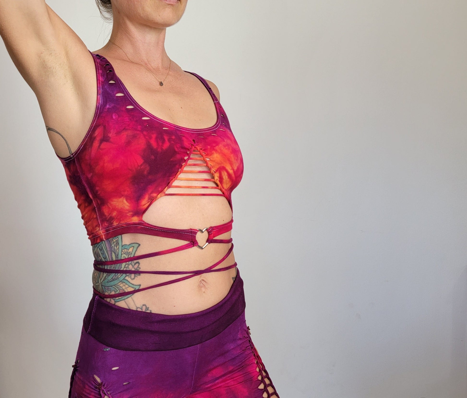 This is the matching top to the lion heart leggings. Featuring a Strappy Front and metal heart and Woven back. This bright color has yellow, orange, pink and purple tones. the ties can be tied multiple ways.