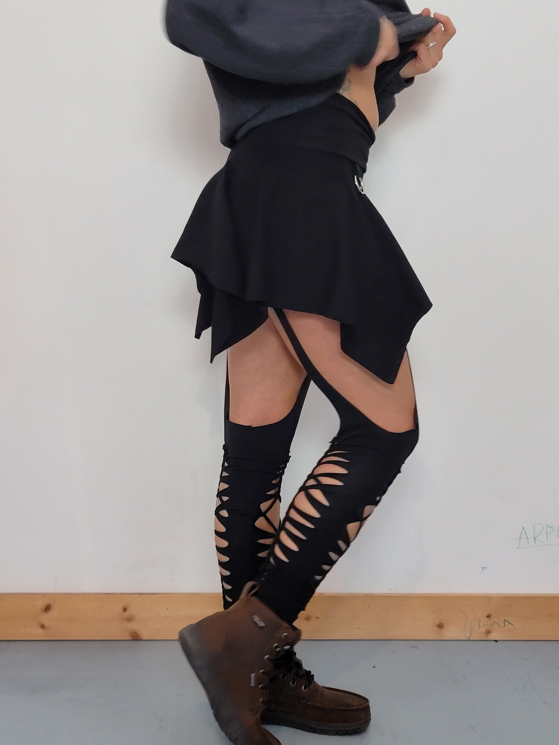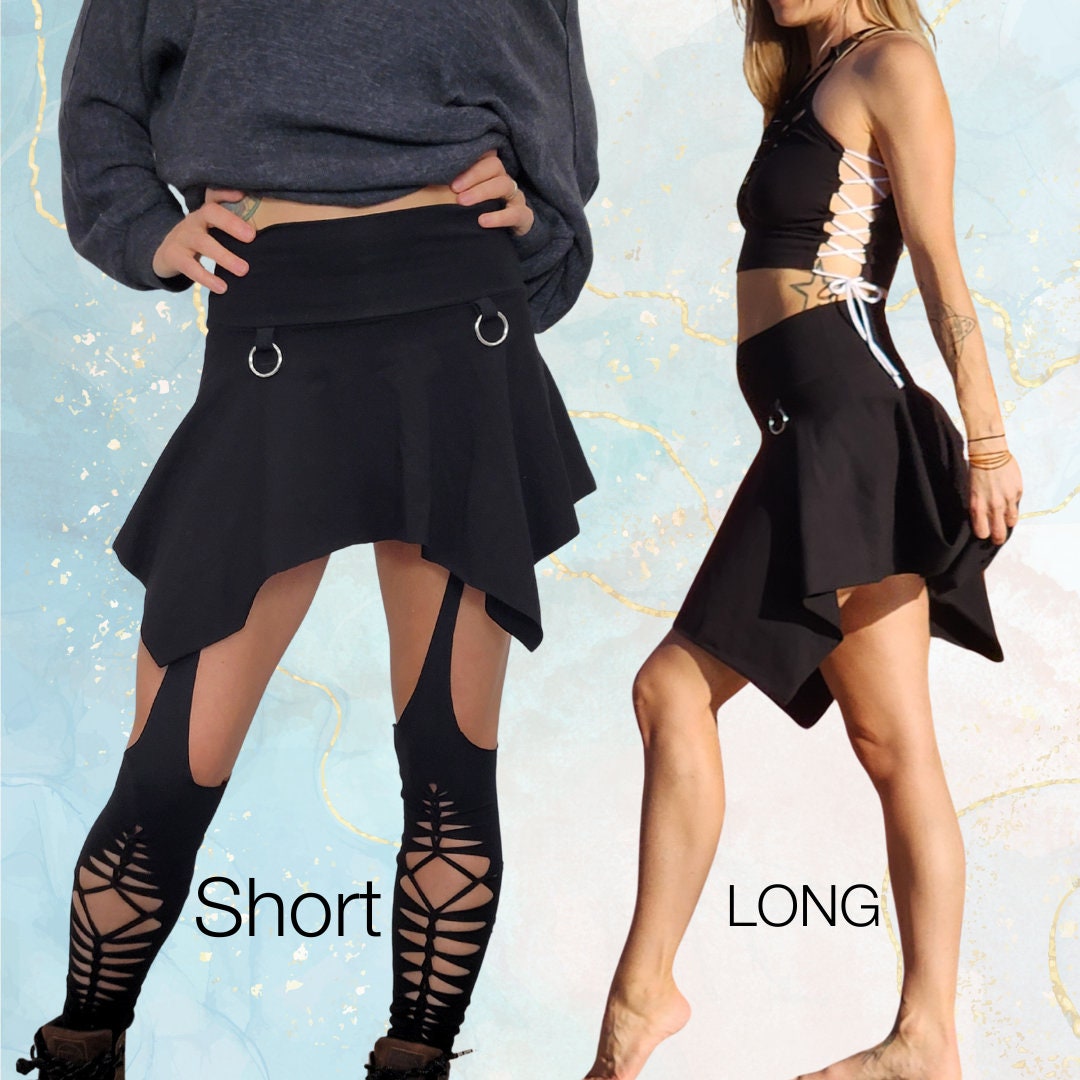 Step up your style game with the Pixie Skirt! Offered in two lengths, Short and long. The short version definitely shows off some booty, and is fun to pair with booty shorts, or garters. The longer length can easily be worn by itself and also is fun to layer. This skirt twirls open like a flower.