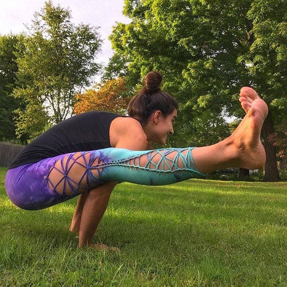 Bright and full of spring, These colors work so well together. Sea glass from the thighs to ankles and Imperial Purple marbling down from the top. Bring a little sunshine to your yoga practice, dance the night away, or wander the town with these unique leggings.