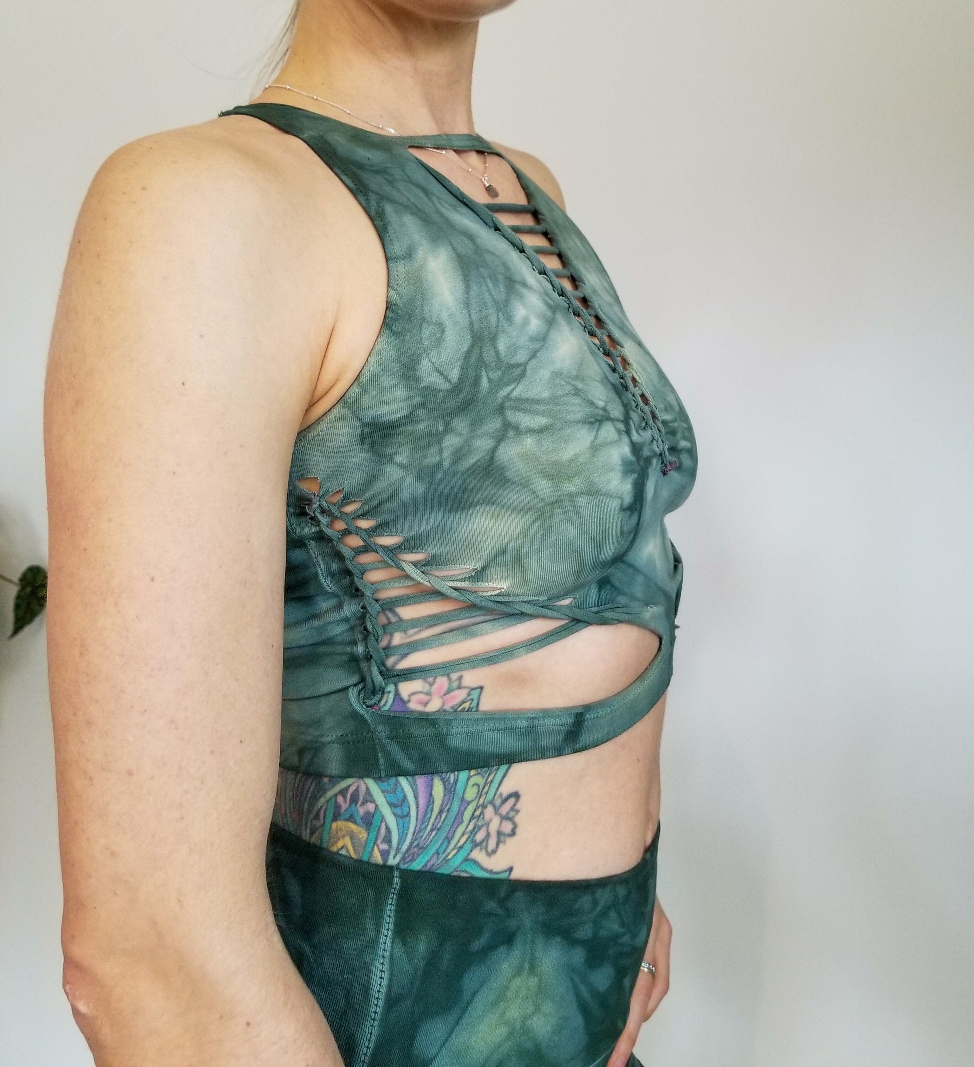 This braid style matches the Sage leggings. With an earthy green sage, featuring an open braided chest, and high neck, and braided design on the back.