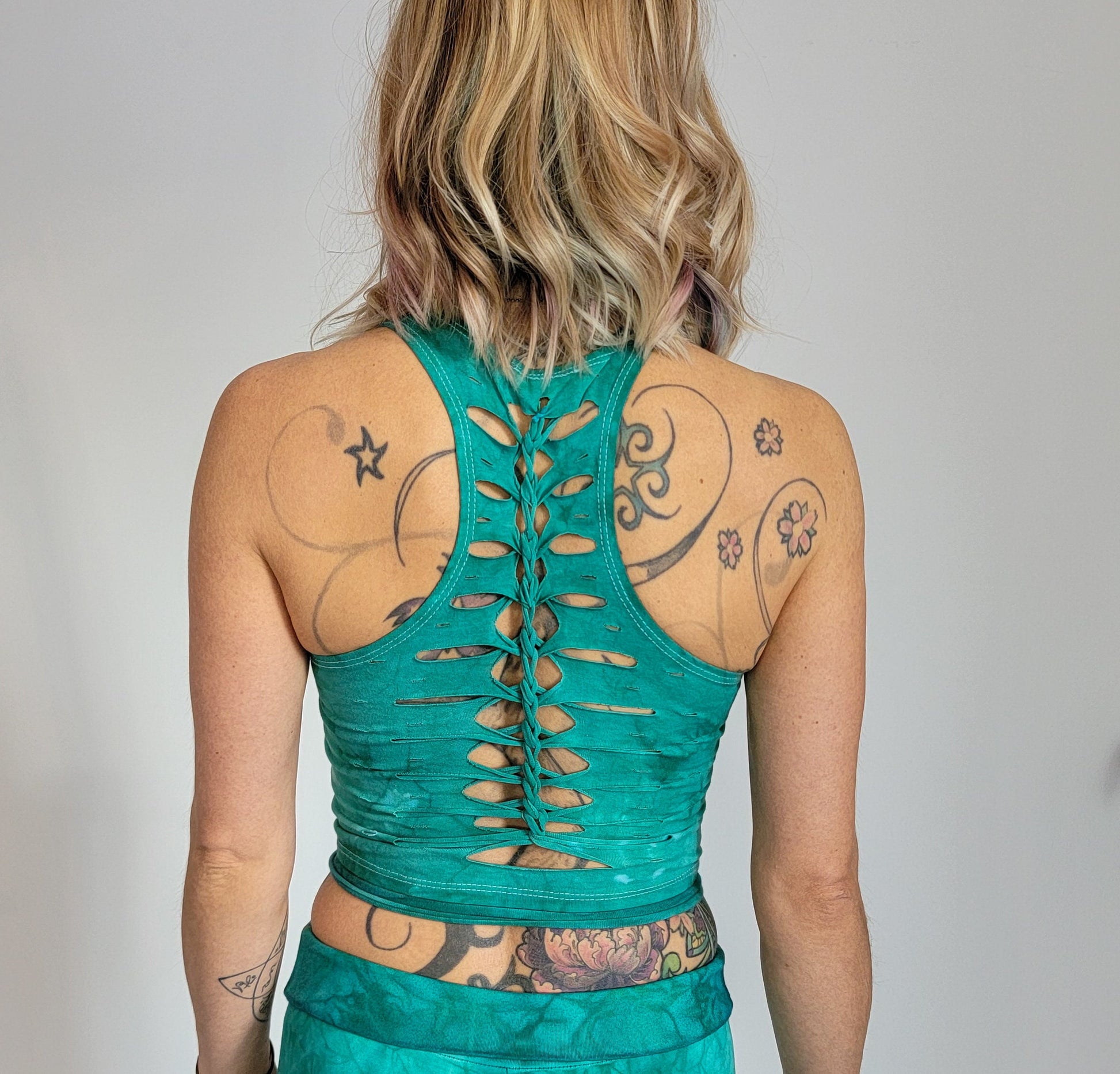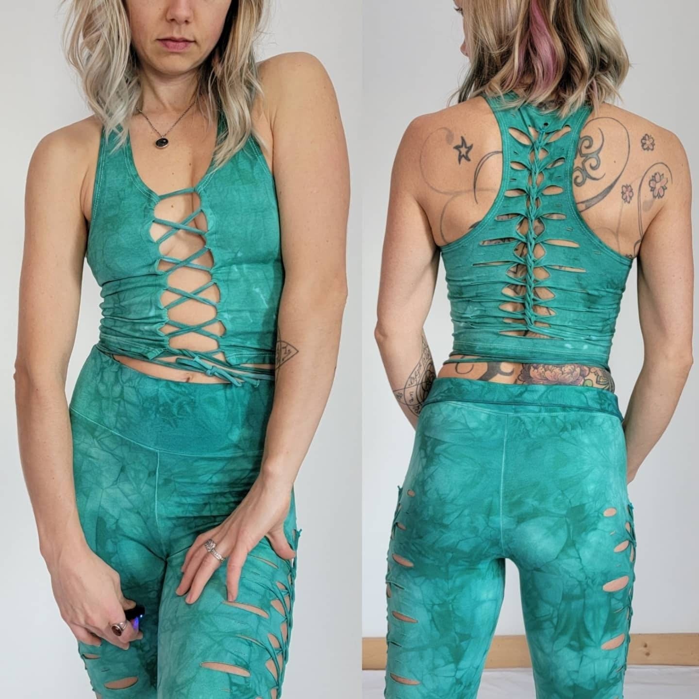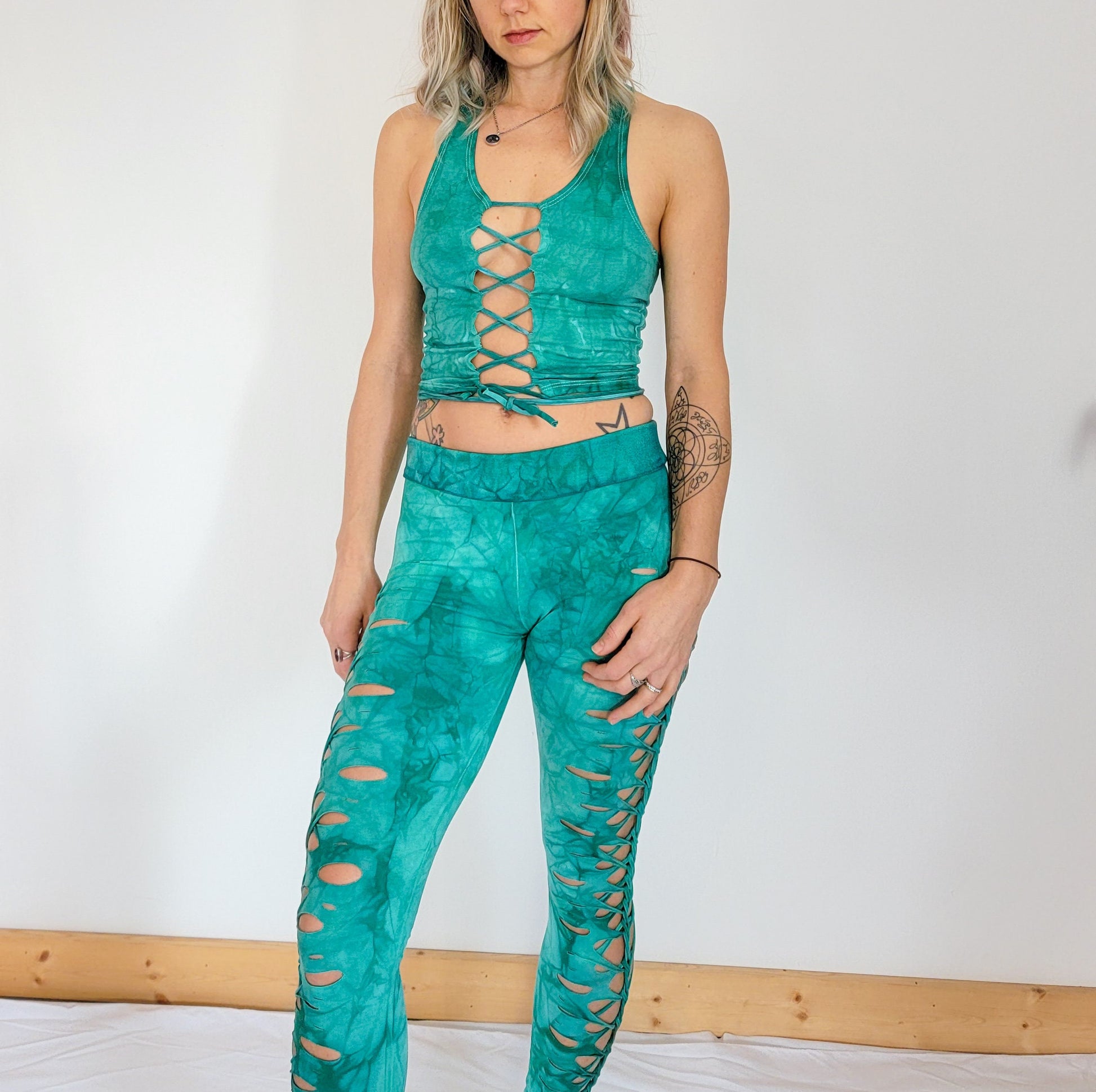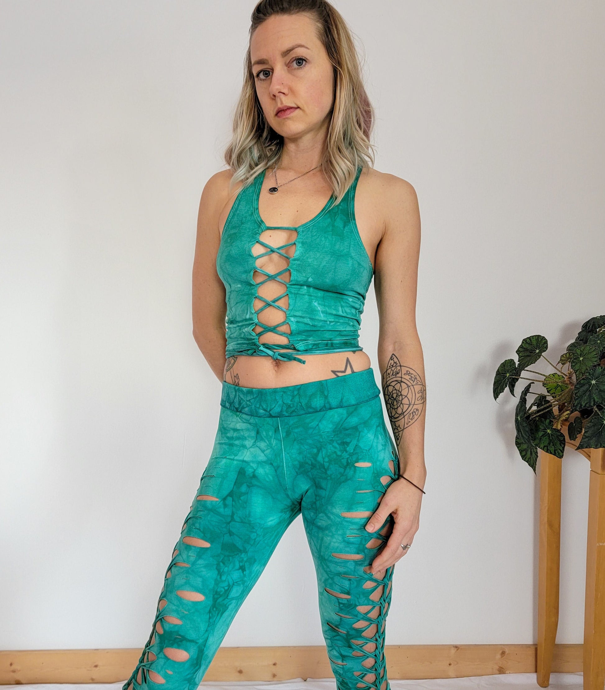 SEA GLASS laced Crop top Hand dyed Yoga Slit weave Fire hula hoop