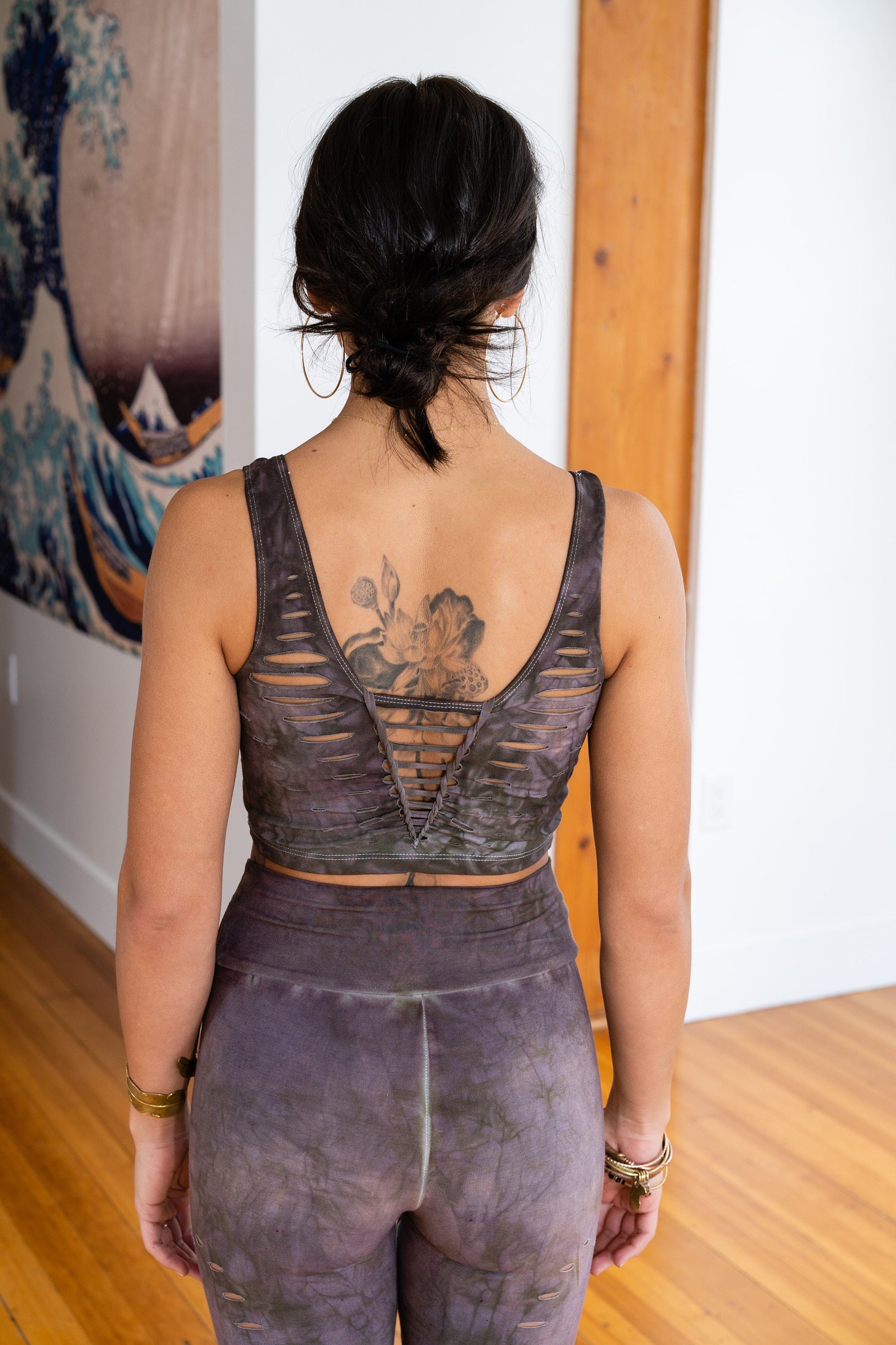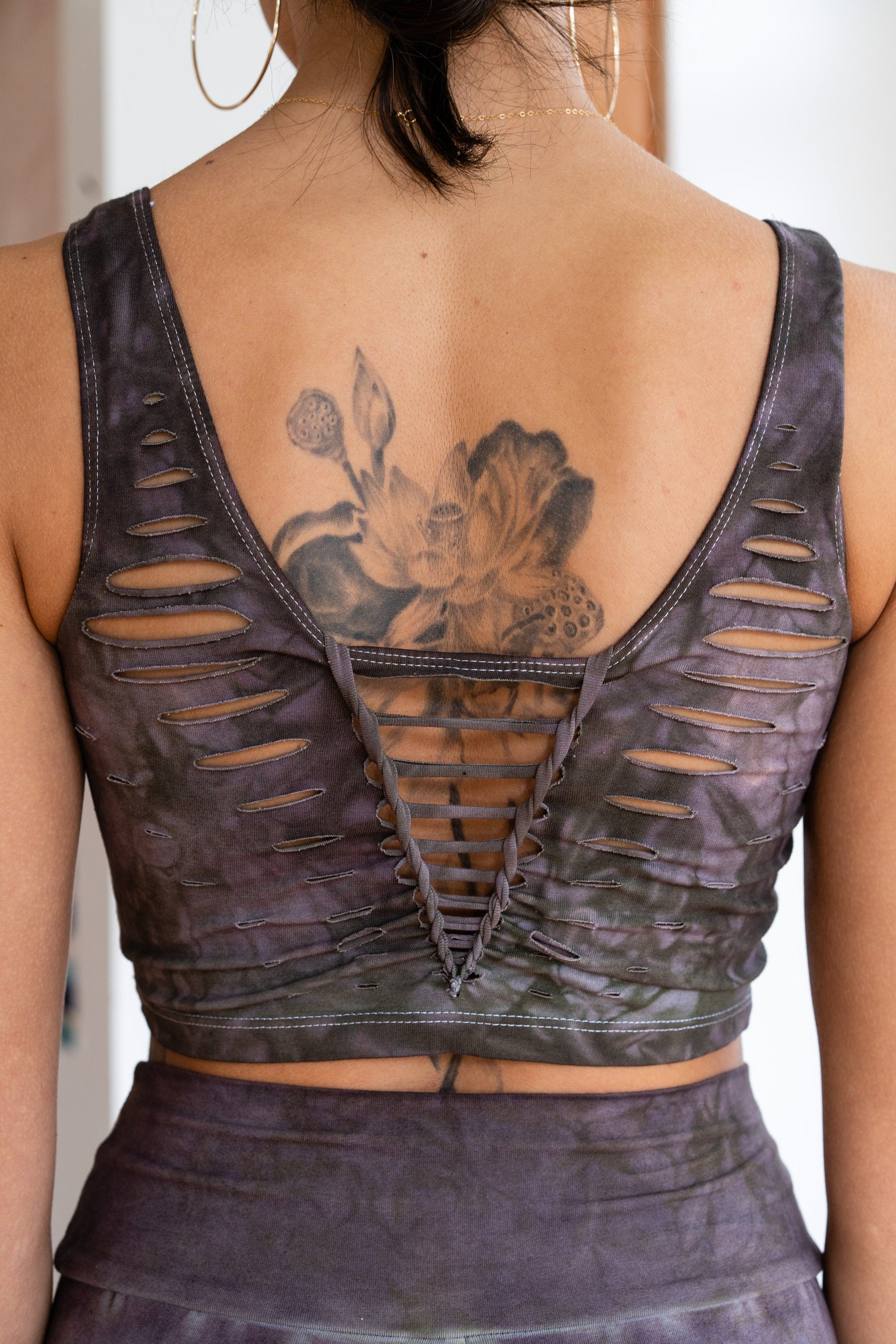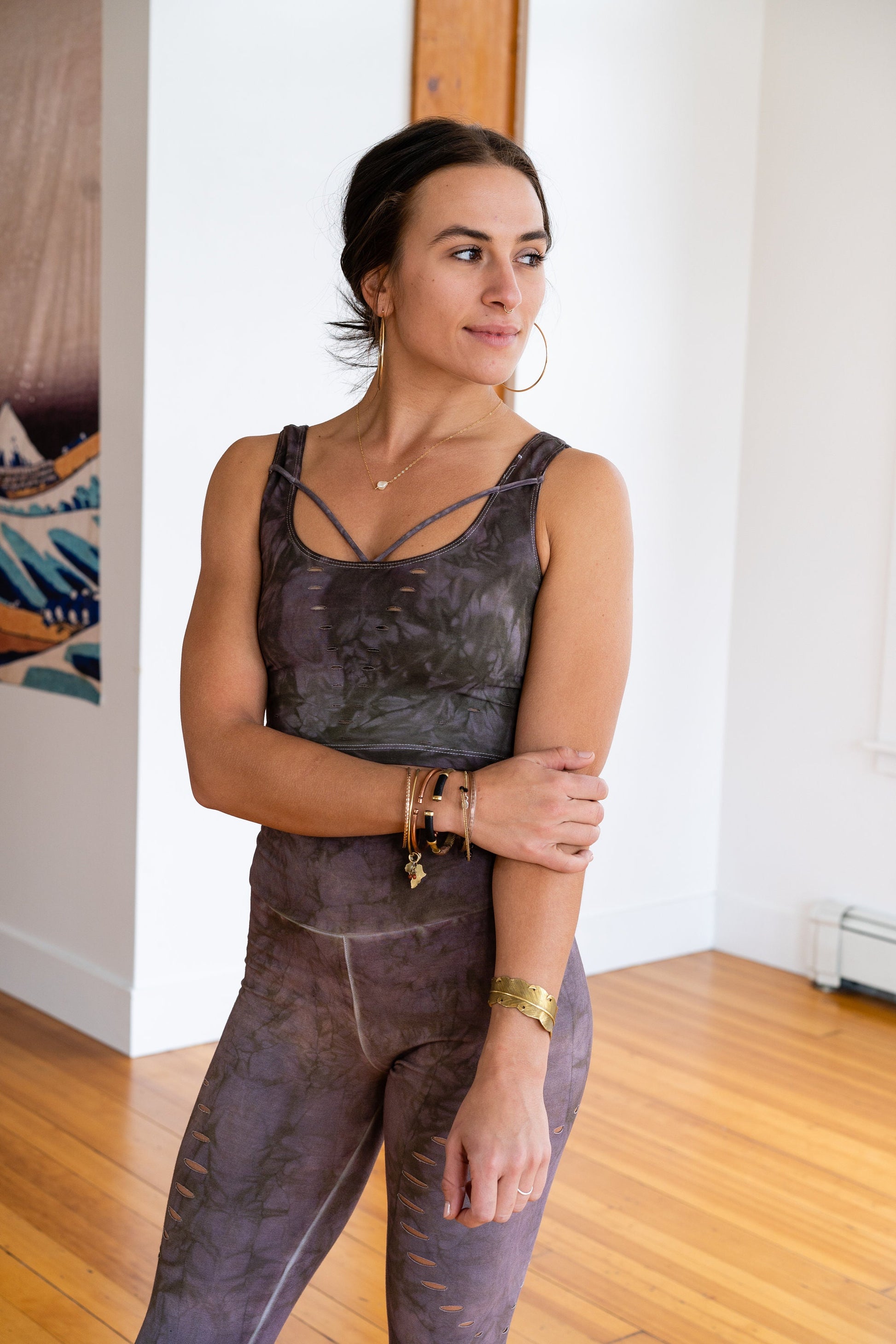 This is the matching top to the Shitake leggings. Featuring a Strappy Front and Woven back. This earthy color has rich brown tones with mauve highlights.