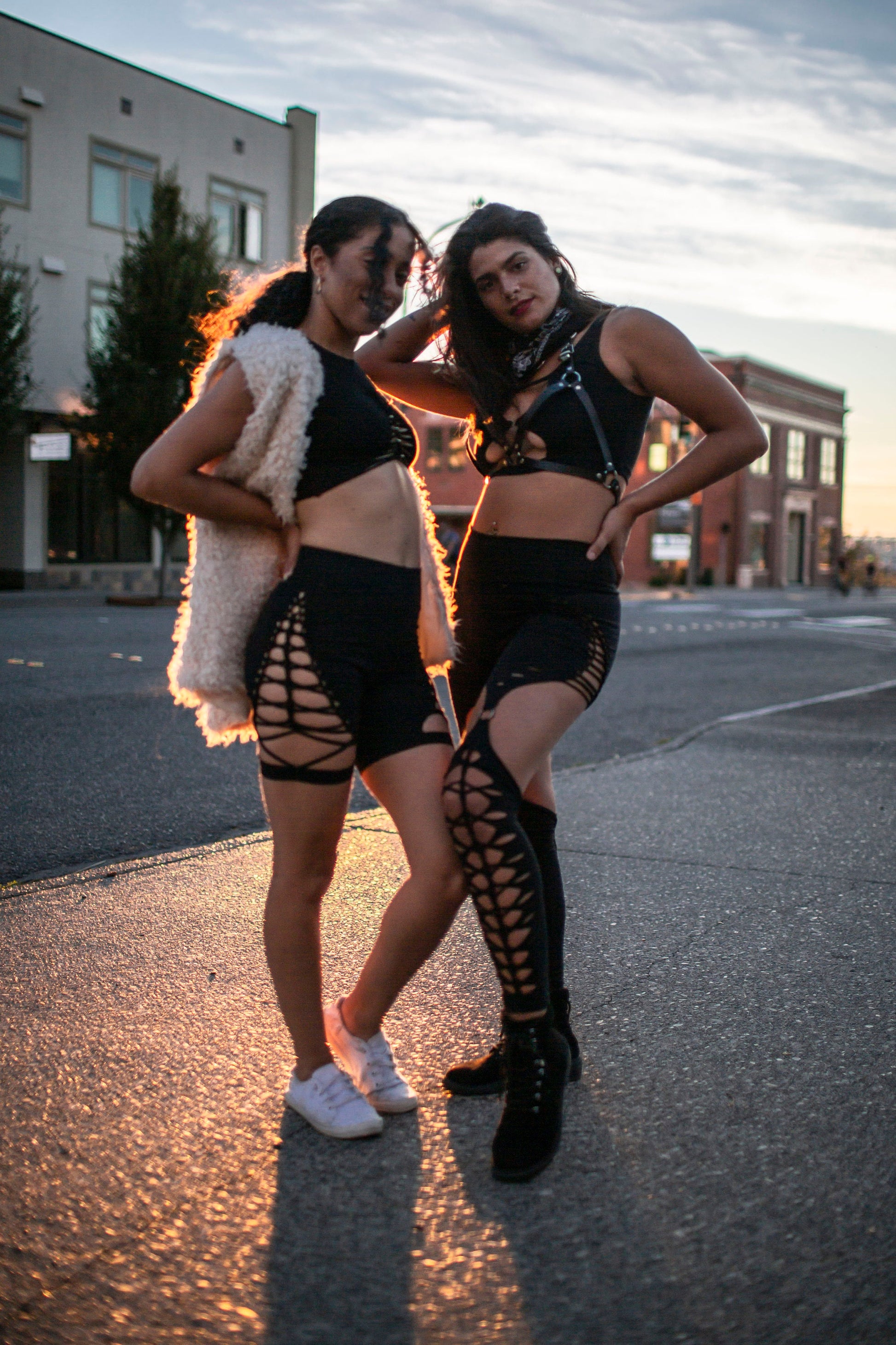 Embrace your inner GODDESS with these Garter Leggings. They are subtly seductive and are made for the ones that like to make a statement. These are a statement at your next festival, on the dance floor, with your hoop, or your next aerial performance. Or a statement at that Pole Class. Braided and cut from upper hip to ankle. Featuring 1" Solid metal rings on the front of the thighs, with a shorts and leg warmers look from the back. These leggings are not only super sexy but super comfortable!